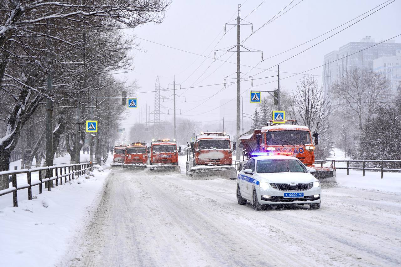 При пиковых осадках для защиты колонн и обеспечения их бесперебойной работы на помощь дорожникам приходят сотрудники Госавтоинспекции. На фото работа автоколонны на улице Ново-Садовой в Самаре 3 февраля.