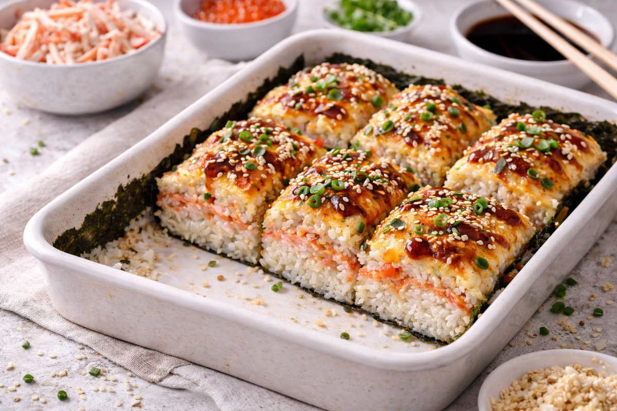 Когда в доме дети, роллы просят постоянно. Заказывать — дорого, крутить — долго. А этот вариант выручает всегда: готовится в одной форме, выглядит эффектно и по вкусу ничем не уступает любимым роллам. Запекаю — и нарезаю, как пирог.