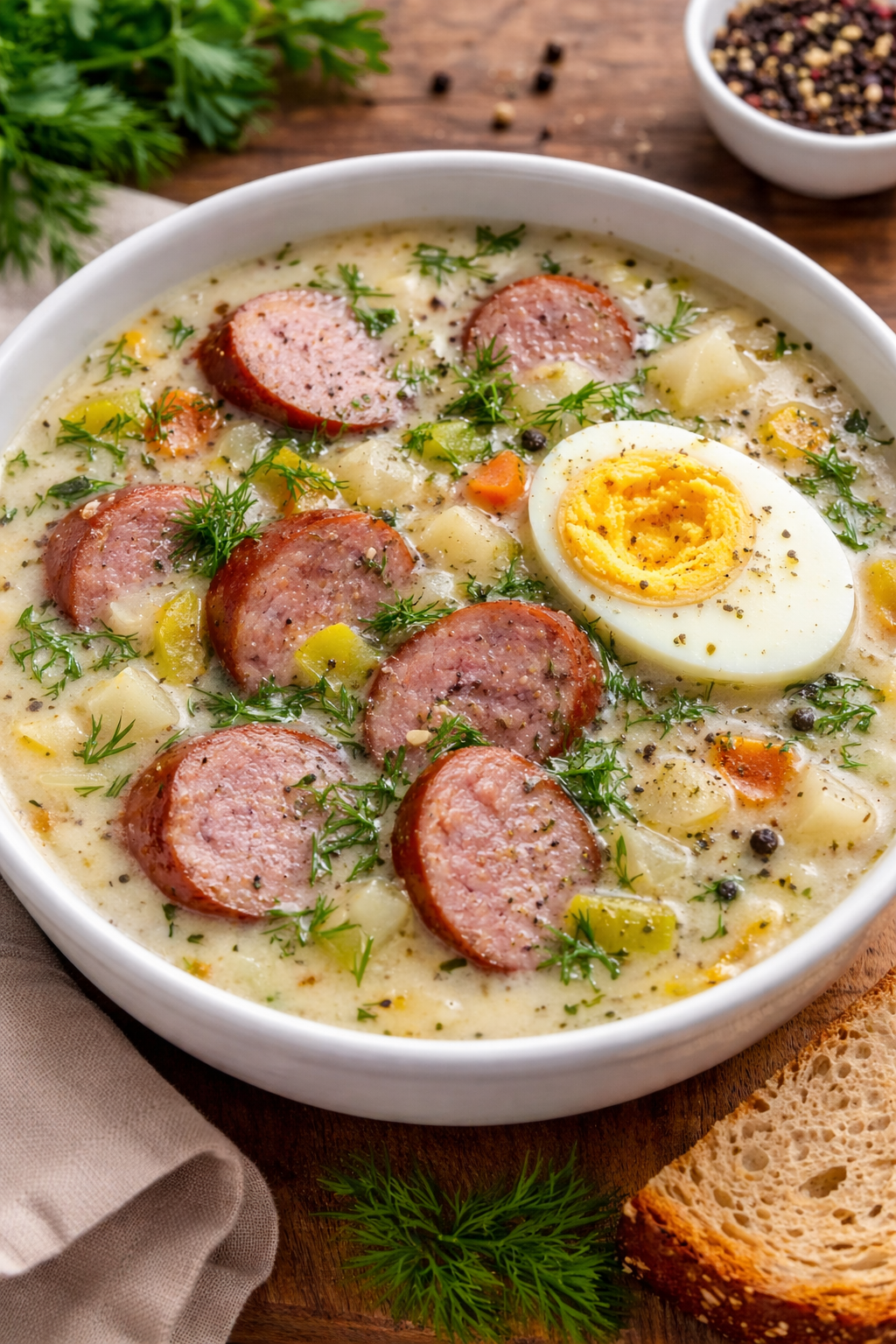 Подаём белый борщ с половинкой варёного яйца и свежим укропом, дополняя тарелку ломтем ржаного хлеба с хрустящей корочкой.
