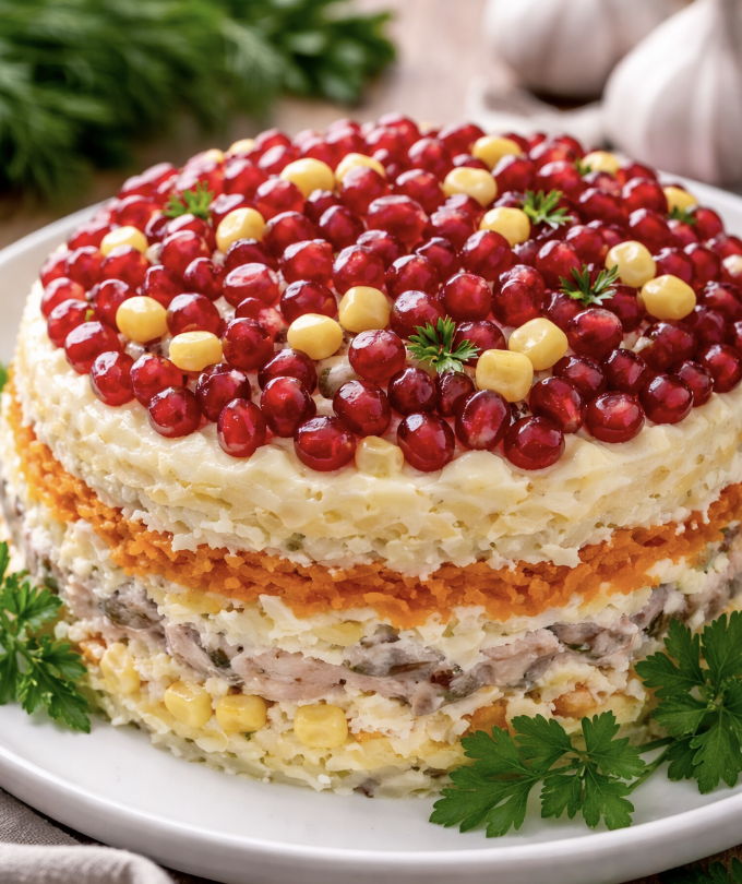 Даю салату постоять в холодильнике 1–2 часа, чтобы слои пропитались. Вкус получается насыщенный, слои сочные, а внешний вид — праздничный. Мясо можно чередовать: курица — нежнее, говядина — ароматнее, язык — придаёт особый вкус. Для украшения добавляю свежую зелень или целые листья салата, чтобы создать красивый контраст. Такой салат можно собрать заранее, а перед приходом гостей лишь перевернуть и украсить, пишет PopCornNews.