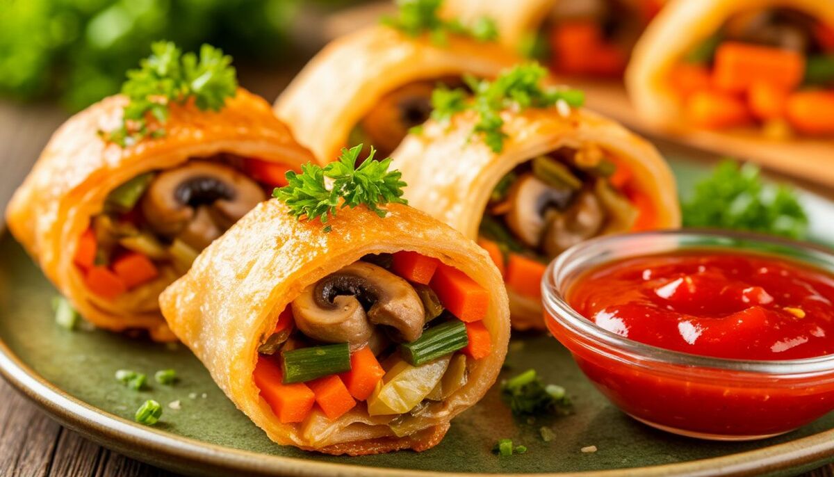 Ингредиенты: Морковь — 100 г, шампиньоны — 100 г, капуста — 100 г, зеленый лук — 2–3 шт., чеснок — 2 зубчика, рисовая бумага — 6–8 листов, соевый соус — по вкусу, кунжутное масло — 1–2 капли, уксус 9% — 0,5 ч. л., финиковый сироп — 1 ч. л., растительное масло — 2–3 ст. л., соль, перец, любимые приправы — по вкусу.