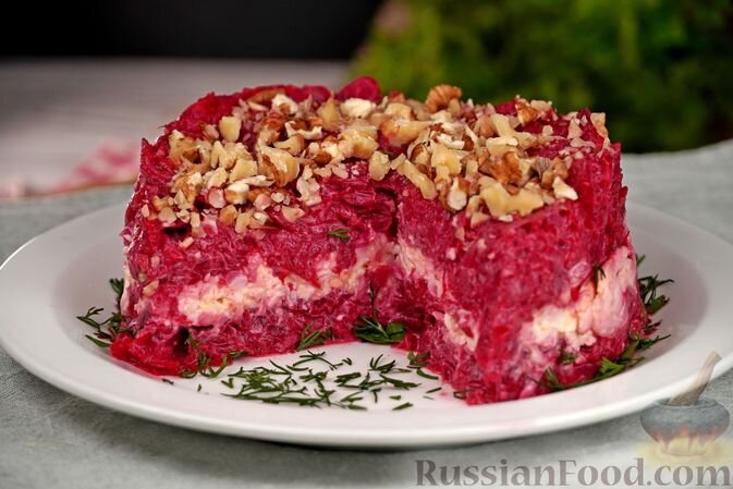 - Слоёный салат со свёклой и морковью. Этот салат станет звездой любого праздника. Яркие слои отварных овощей и нежного сыра, дополненные грецкими орехами и клюквой, превращают его в привлекательное кулинарное произведение.