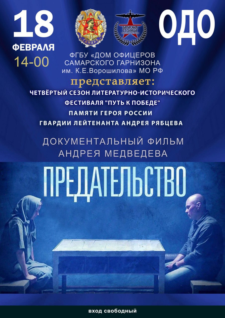 Доброе утро, Сергей! 18 февраля в 14-00 в Большом зале Дома офицеров Самарского гарнизона состоится показ документального фильма «Предательство». По итогам показа фильма будет организовано обсуждение просмотренного материала с компетентными специалистами в области педагогики, психологии и культуры.