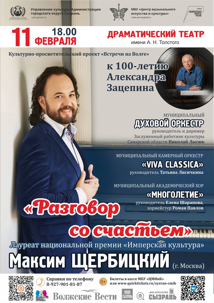 11 февраля, 18:00, Драматический театр — Концертная программа «Разговор со счастьем» с участием Максима Щербицкого (Москва) и творческих коллективов Центра музыкального искусства и культуры. Можно купить билет по «Пушке».