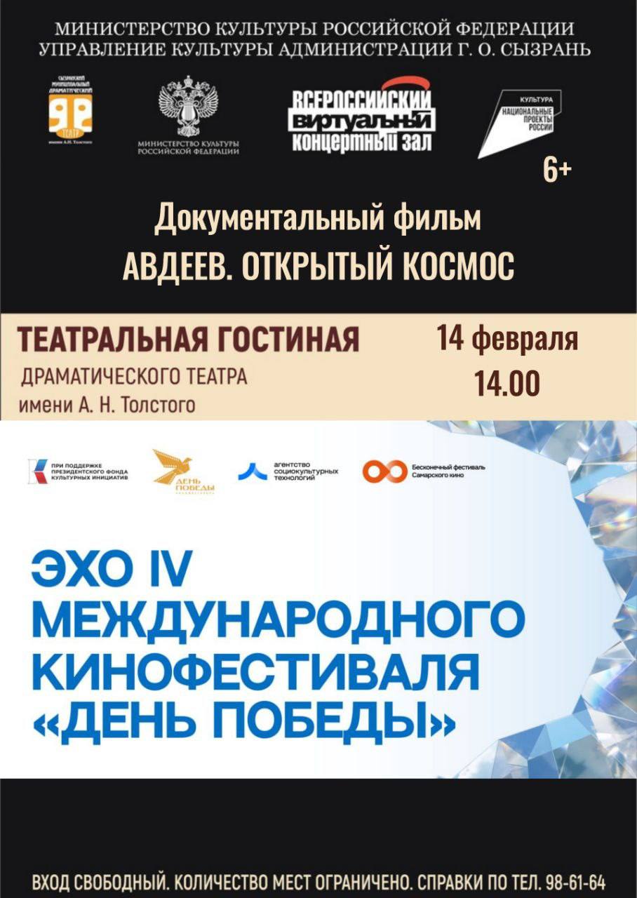 • 14 февраля, 14:00 — трансляция документального фильма «Авдеев. Открытый космос»