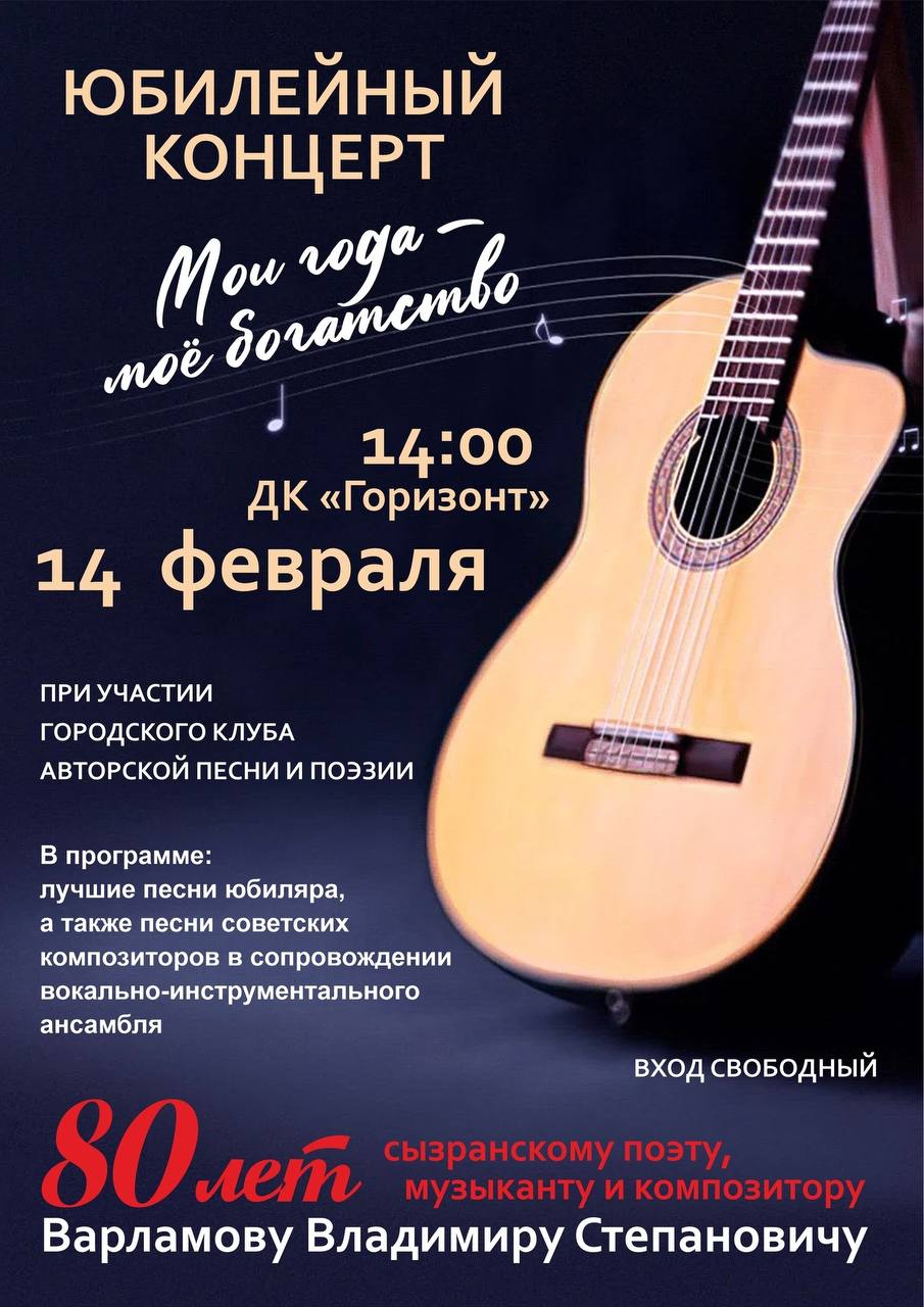 14 февраля, в 14:00, ДК «Горизонт» — юбилейный концерт «Мои года — моё богатство», посвящённый 80-летию Владимира Варламова, поэта, музыканта, композитора. Вход свободный.