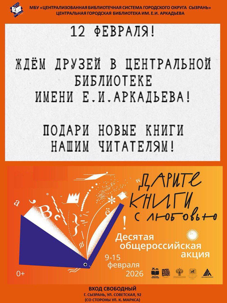 Общероссийская акция«Дарите книги с любовью» проходит с 9 по 15 февраля. Библиотеки организуют игровые программы, громкие чтения и обзоры книг, мастер-классы, флешмобы, выставки и принимают в дар книги от читателей. Присоединяйтесь!