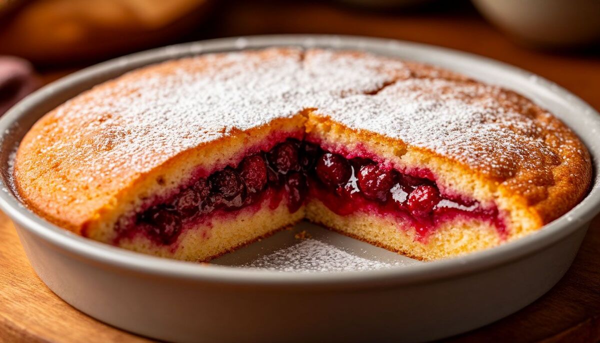 Форму смазываю маслом, выливаю половину теста, сверху равномерно распределяю ягоды или выкладываю варенье. Заливаю оставшимся тестом и слегка разравниваю поверхность.