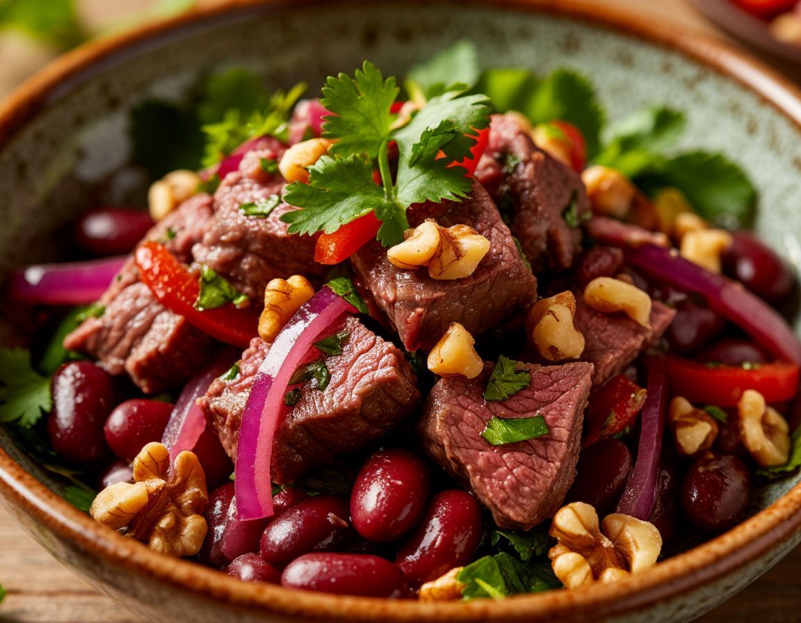 Ингредиенты: говядина отварная — 300 г, красная консервированная фасоль — 250 г, красный лук — 2 шт., сладкий перец — 1 шт., грецкие орехи — 50 г, кинза — средний пучок, чеснок — 2 зубчика, хмели-сунели — 1 ч.л., красный острый перец хлопьями — ? ч.л., чёрный молотый перец — по вкусу, соль — по вкусу, оливковое масло — 5 ст.л., винный уксус — 2 ст.л.; для маринада лука: соль — ? ч.л., сахар — 1 ч.л., винный уксус — 2 ст.л.