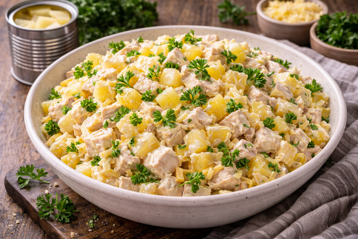 Есть салаты, которые сначала вызывают скепсис, а потом исчезают со стола первыми. «Жар-птица» как раз из таких: сладковатый ананас, нежная курица и сыр дают неожиданно гармоничный и очень запоминающийся вкус. Получается лёгкий, сочный и праздничный салат, который выручает, когда нужно быстро приготовить что-то небанальное — без долгой возни.