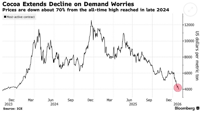Недавние колебания на рынке какао привели к тому, что цены на фьючерсы в Нью-Йорке впервые с 2023 года упали ниже отметки в 4000 долларов за тонну. Это произошло на фоне снижения спроса, которое оказывает дестабилизирующее влияние на шоколадную индустрию.