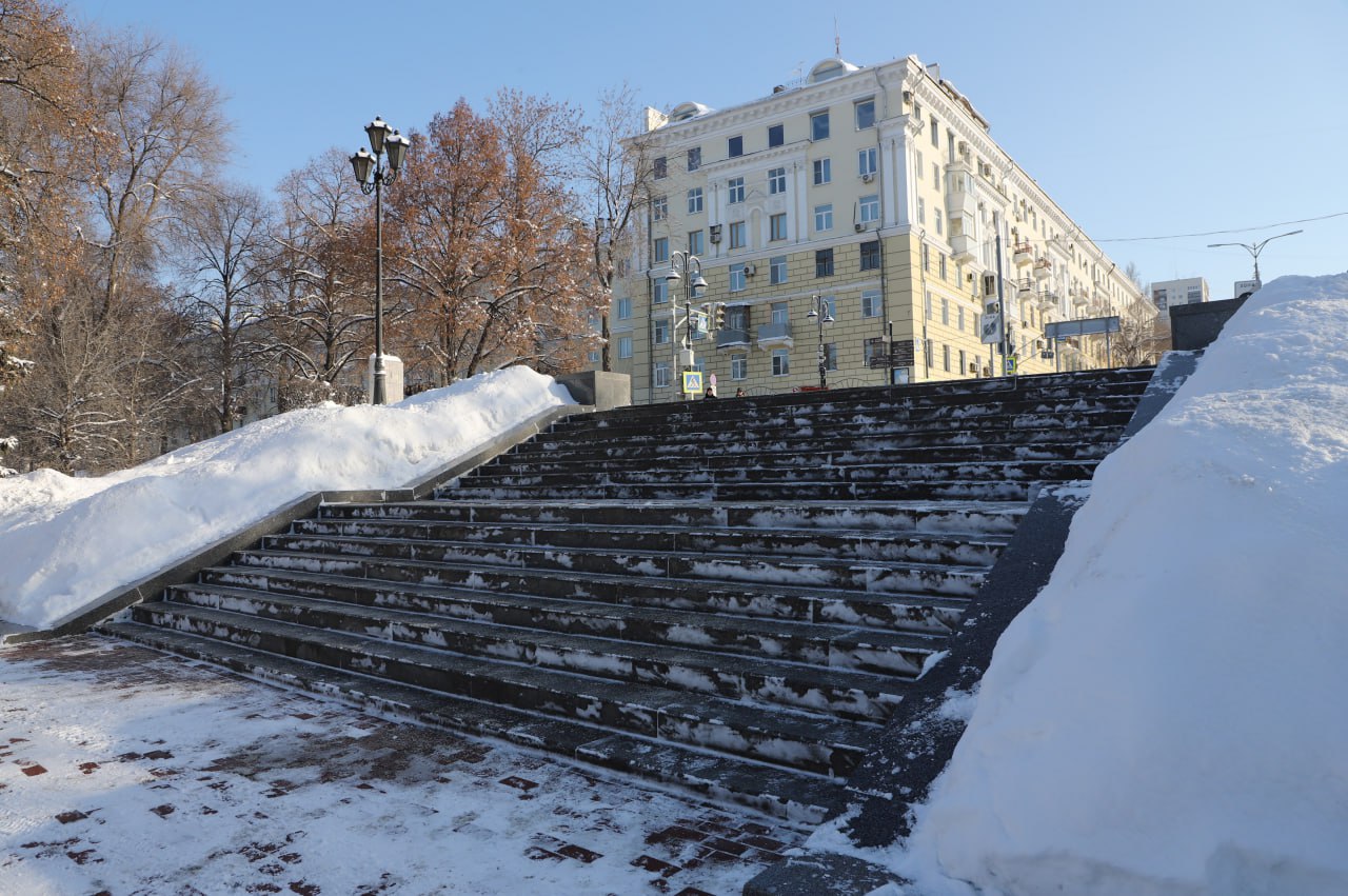 Зима — это уникальная возможность насладиться красотой снежного пейзажа. Для обеспечения безопасного передвижения жителей специалисты вручную и с помощью спецтехники очищают и подметают тротуары и лестницы.