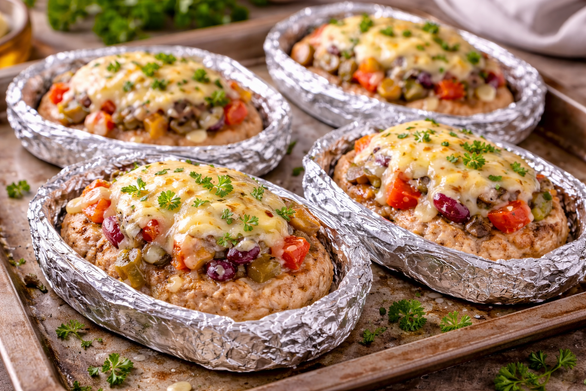 Приготовление: куриный фарш соедините с мелко нарезанным репчатым луком, солью, перцем, сухим чесноком и топлёным маслом. Хорошо вымесите массу. Сформируйте порционные биточки и выложите их в лодочки из фольги или пергамента, слегка делая углубление в центре. Для начинки мелко нарежьте красный лук, солёный огурец, шампиньоны и помидор. Посолите, добавьте орегано и перемешайте. Разложите овощную начинку поверх биточков. Смешайте майонез, тёртую моцареллу и измельчённый чеснок. Нанесите сырную массу сверху на каждый биточек. Запекайте в разогретой до 180 °C духовке 30–35 минут до аппетитной золотистой корочки. Подавайте горячими прямо в лодочках — удобно, красиво и очень вкусно, пишет PopCornNews.