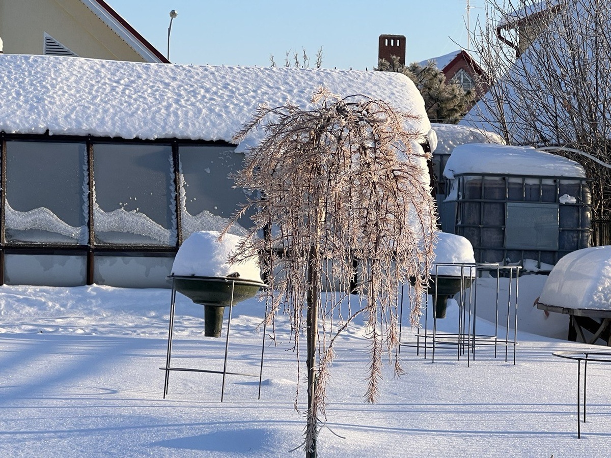 Наступление зимы — это также повод подрезать или убирать выращенные за сезон побеги. Ветки лиственницы часто касаются земли, образуя эффектный кулон. Тем не менее, снег, накапливающийся на ветвях, может привести к их поломке, поэтому важно следить за состоянием побегов и по возможности очищать их от снега.
