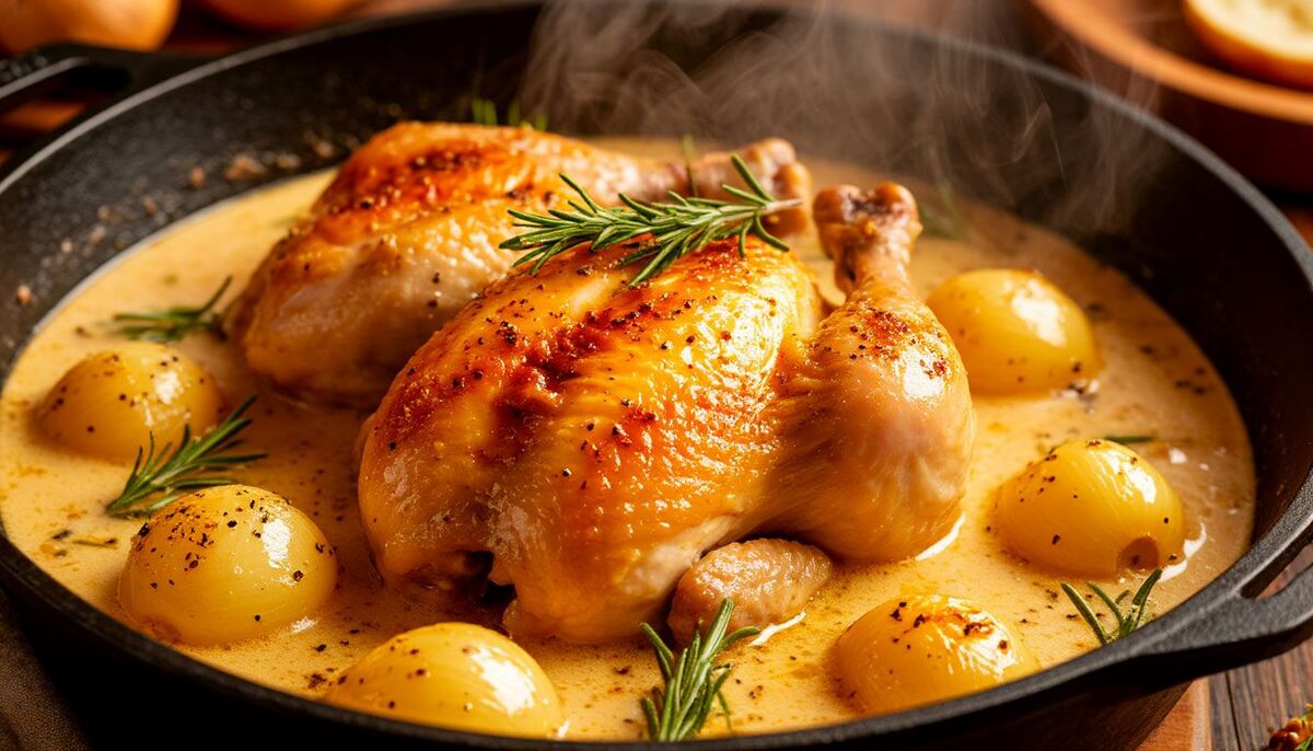 Ингредиенты: курица (бёдра, голени, грудка) — 1-1.2 кг (8-10 кусков), чеснок — 30-40 зубчиков, бульон куриный или вода — 400 мл, сливочное масло — 30 г, масло растительное — 1 ст.л., мука — 2 ст.л., молоко — 3 ст.л., соль, перец чёрный молотый, сушёный орегано или прованские травы, пишет PopCornNews.