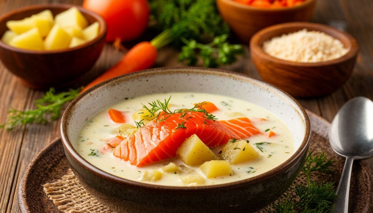 Этот суп — идеальный вариант, когда хочется лёгкого, нежного и сытного блюда без долгой готовки. Он готовится за полчаса из простых ингредиентов, а результат впечатляет: сливочная основа подчеркивает благородный вкус малосольной красной рыбы, овощи добавляют лёгкую сладость и структуру. Настоящее объятие в тарелке.