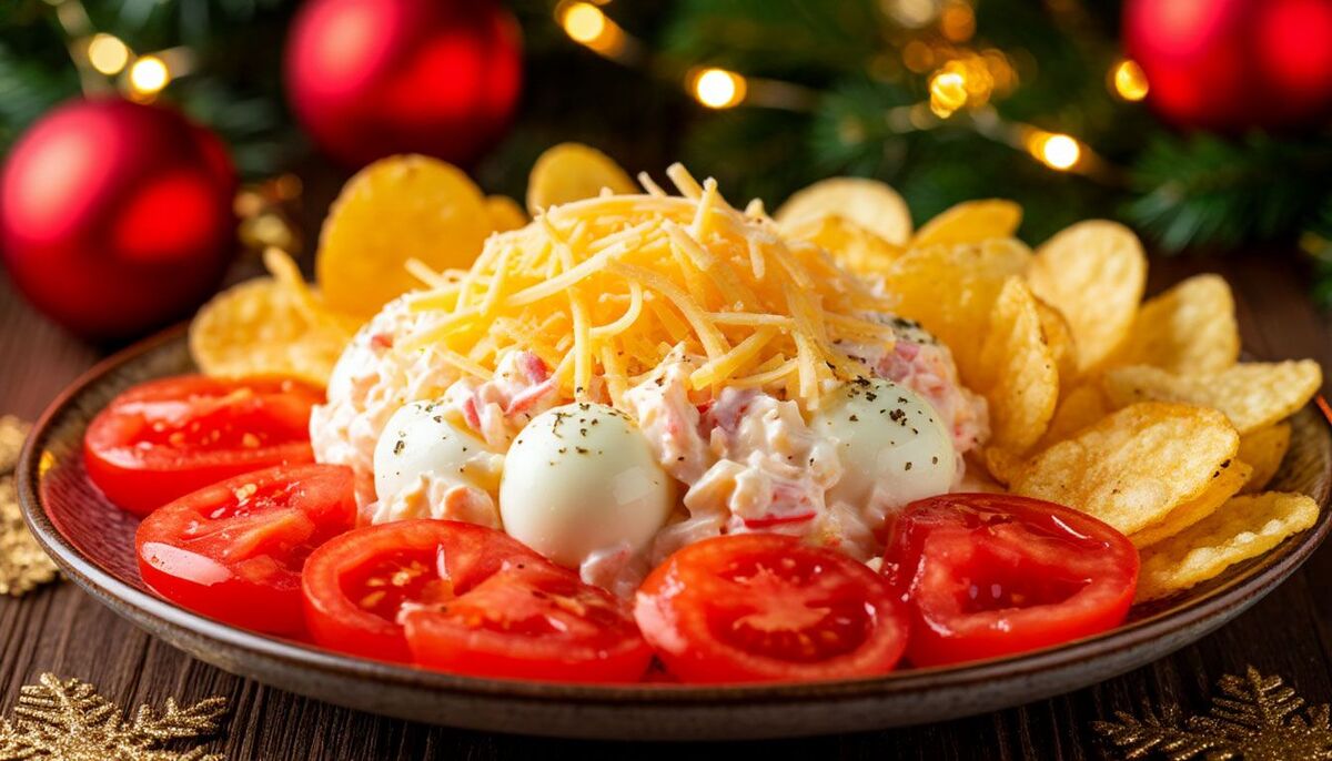 Салат-экспресс, который готовится буквально за пять минут из простых продуктов. Все ингредиенты нарезаются крупными кубиками, а вместо традиционных сухариков используются хрустящие чипсы. Благодаря такому составу салат сохраняет свежесть и моментально съедается — отличное решение для неожиданных гостей или быстрого перекуса.
