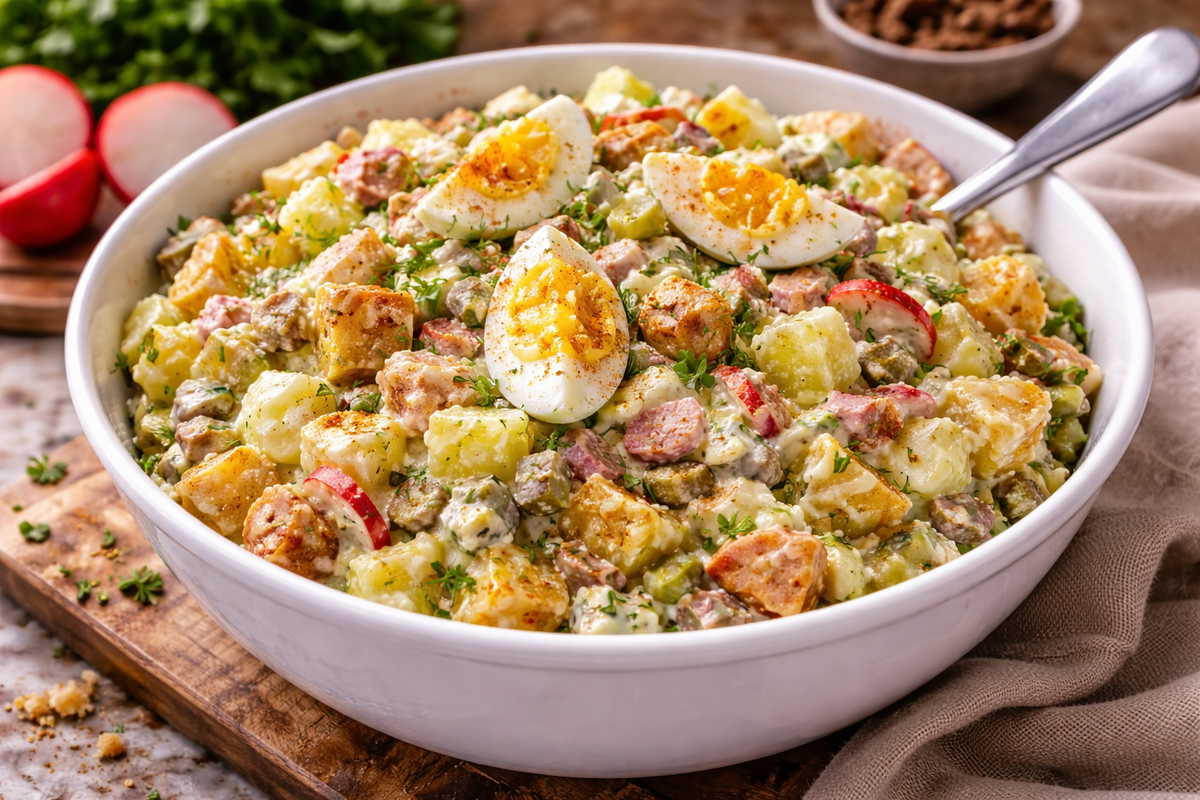 Ингредиенты: картофель — 400 г, яйца — 6 шт., маринованные огурчики (корнишоны) — 8 шт., красный или обычный лук — 1 небольшая головка, редис — 4 шт., растительное масло — 2–3 ст. л., соль — по вкусу, чёрный перец — по вкусу, паприка — по вкусу, майонез — 250 мл, молоко 2% — 1 ст. л., горчица — 1 ч. л., сахар — ? ч. л., соль — ? ч. л., чёрный молотый перец — ? ч. л.
