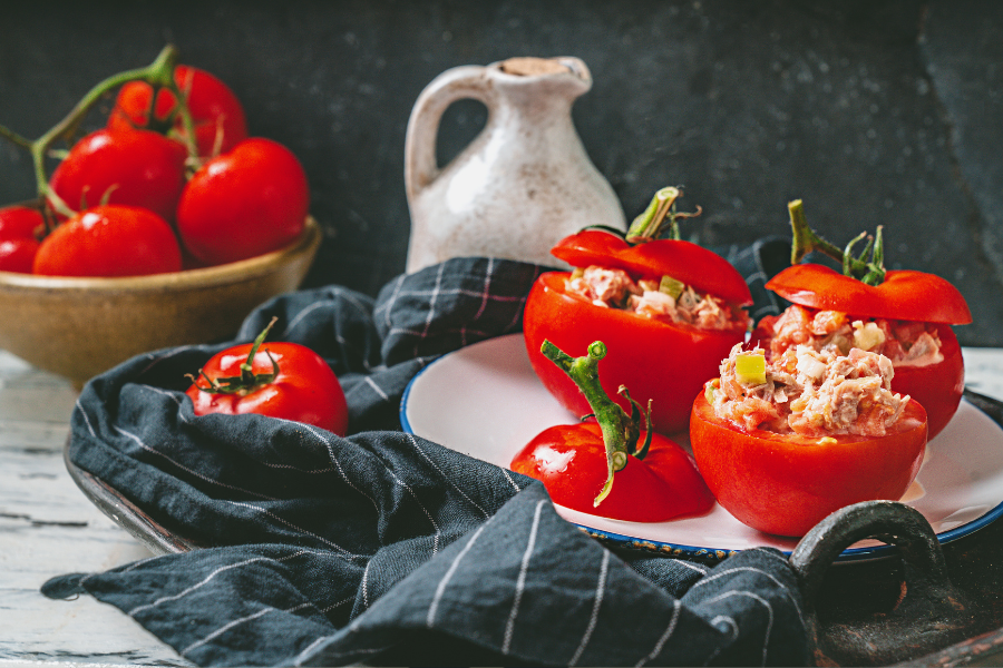 1. Помидоры тщательно вымыть, обсушить и аккуратно отрезать верхушки. Чайной ложкой вынуть мякоть, перевернуть бочонки на бумажные полотенца, чтобы избавиться от лишней влаги. Перед тем как фаршировать, посолите их изнутри.
