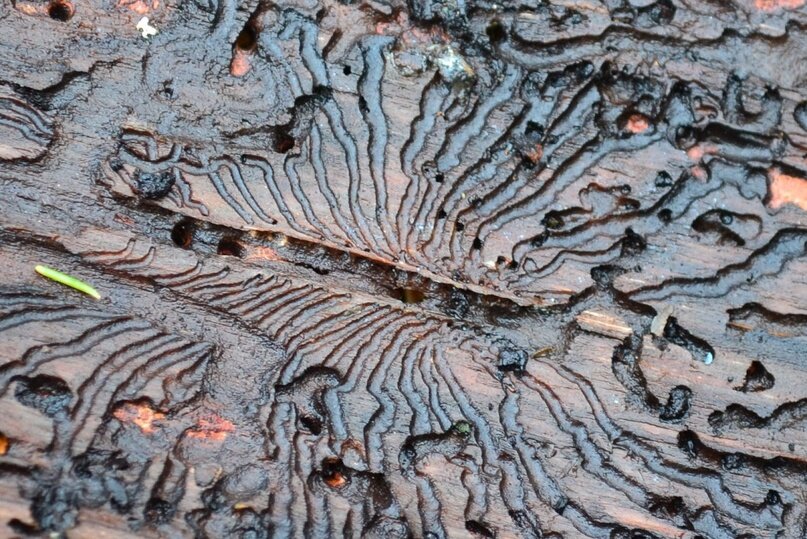 - Дырочки и тоннели на коре, указывающие на активность короеда.