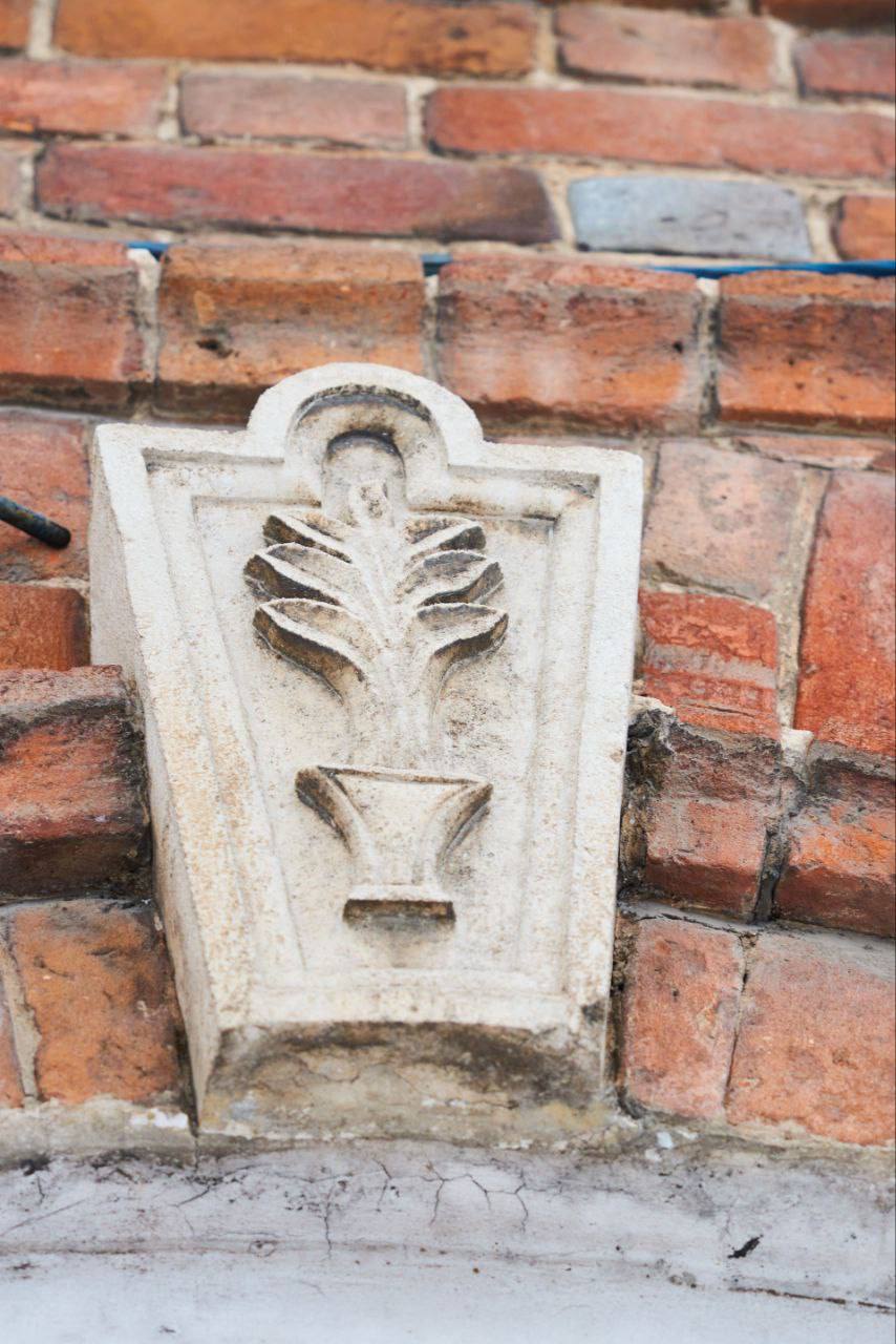 В оформлении фасада использованы уникальные замковые камни над дверными и оконными проёмами, на которых изображены растения в горшках. Часть элементов декора выполнена из белого камня.