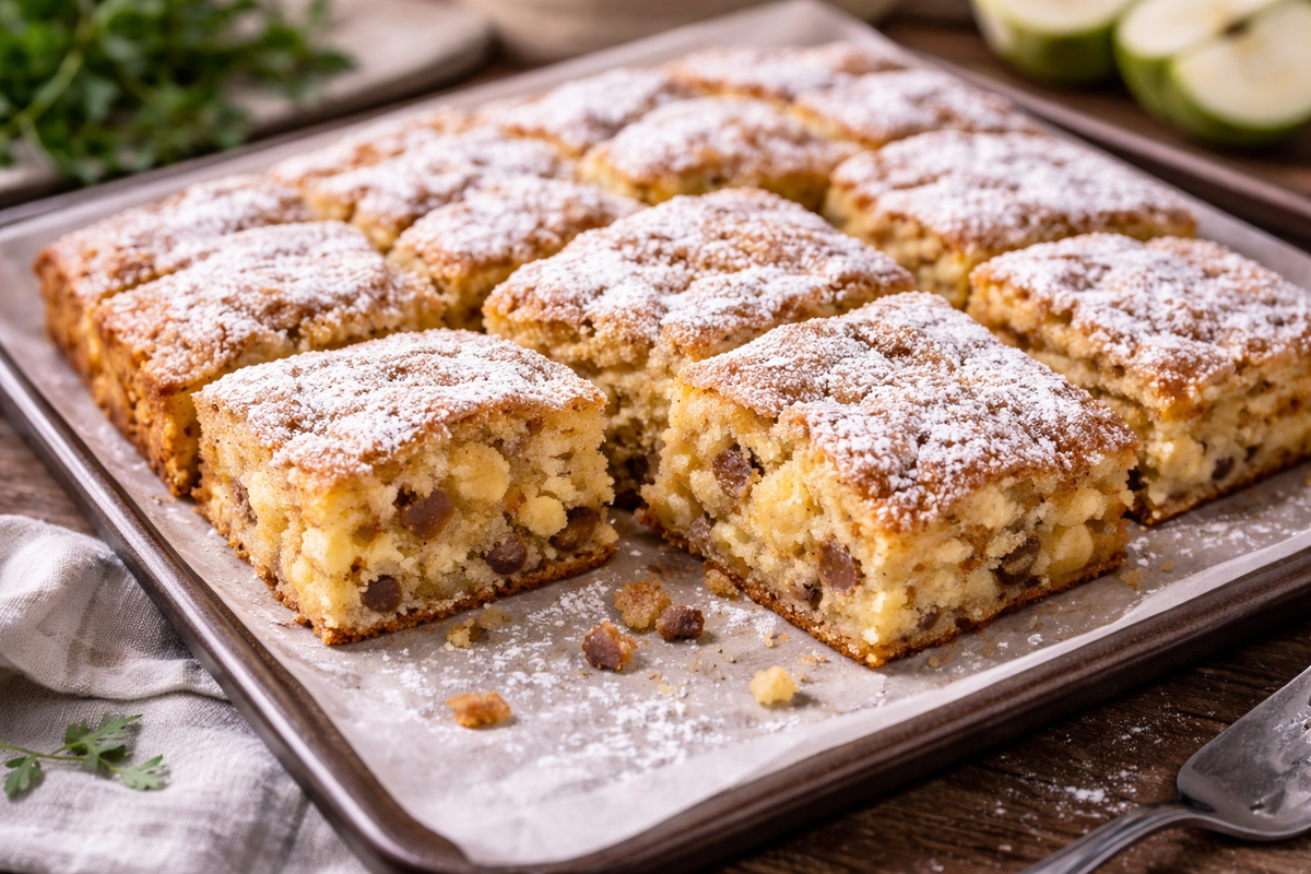 Приготовление: яйца взбейте с солью до светлой пышной массы. Добавьте сахар и ванильный сахар, перемешайте до растворения. Влейте растопленное и остуженное сливочное масло. Муку соедините с разрыхлителем и частями вмешайте в тесто — оно получится густым и слегка липким. Яблоки очистите, нарежьте мелкими кубиками, сбрызните лимонным соком и добавьте в тесто вместе с промытым изюмом. Перемешайте. Противень застелите пергаментом, смажьте маслом, выложите тесто и разровняйте. Выпекайте при 180 °C около 25 минут до румяной корочки. Остудите и посыпьте сахарной пудрой, пишет PopCornNews.