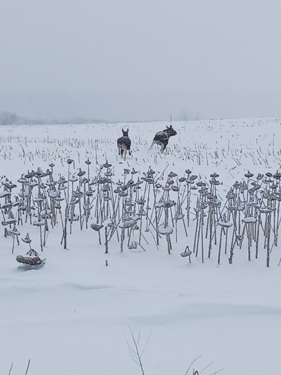 То, что фермеры не убрали вовремя стало добычей копытных. Думали, что только люди вечерами коротают время за семечками? Оказывается лоси тоже не против пощёлкать, расценивая это как дополнительную подкормку.
