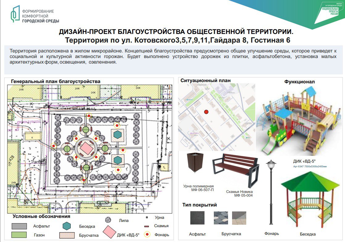 Территория в обрамлении ул. Котовского, 3-11, ул.Гайдара,8 и ул.Гостиная,6. Будет выполнено устройство дорожек из плитки, асфальтобетона, установка детского игрового комплекса, скамеек, урн, фонарей освещения, озеленения.