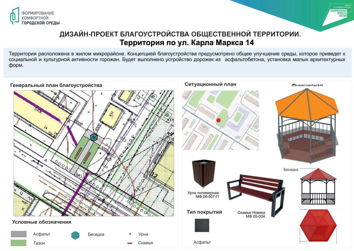 Территория на ул. К.Маркса, 14 с беседкой, газонами, скамейками, урнами и пешеходными дорожками.