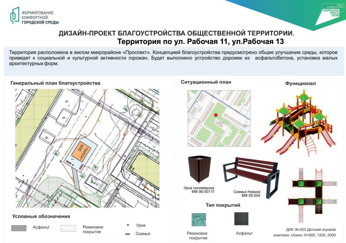 Территория по ул. Рабочая, 11-13. Детская площадка с игровым комплексом на резиновом покрытии с асфальтовыми дорожками, скамейками и урнами.