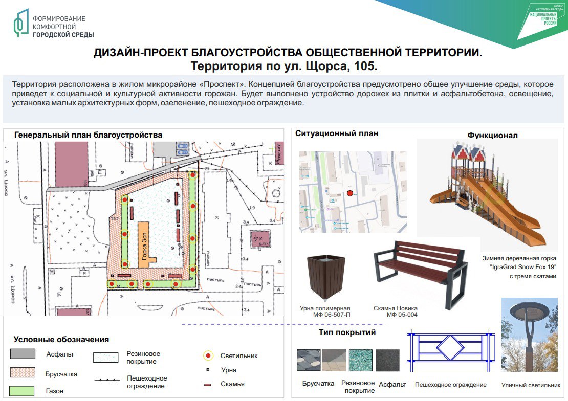 Территория по ул. Щорса, 105. Будет выполнено устройство дорожек из плитки и асфальтобетона, освещения, озеленения, пешеходного ограждения, скамеек, урн и деревянной зимней горки с тремя скатами.
