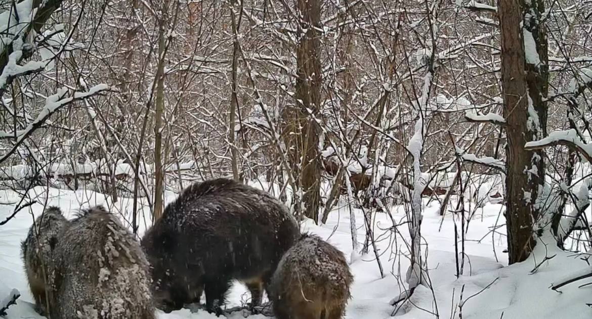 Стадо из взрослых самок и молодняка разрывает снег в поисках корма — под сугробами желуди, коренья и личинки. Один кабанчик даже нашёл добычу, но старший сородич быстро отогнал его с рычанием.