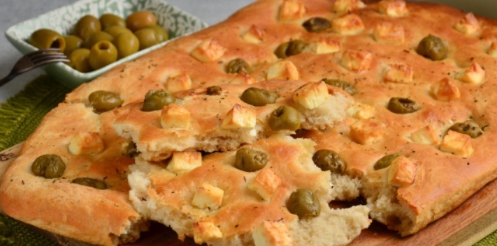 Разогрейте духовку и подготавливайте противень с фольгой и маслом. Выложите тесто, сделайте углубления и разместите в них оливки с сыром. Осталось только сбрызнуть маслом и посыпать травами. Запекайте 15-20 минут при 180 градусах, и вот, фокачча готова!