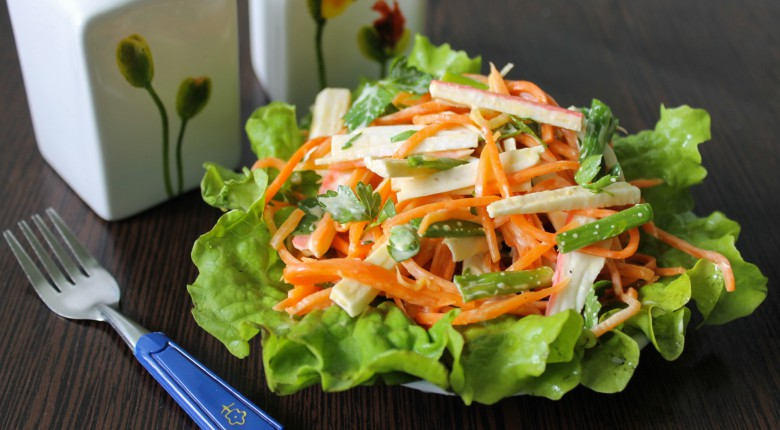 1. Первым делом, выложить морковь в салатник, создавая основу для нашего блюда.