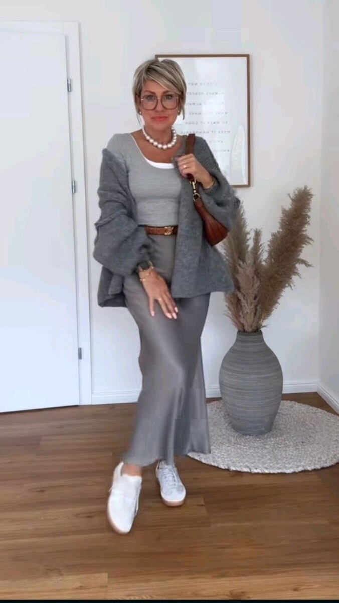 - Элегантный комплект: Длинная атласная юбка в сером цвете и светло-серая футболка с белым декором создают женственный образ. Оверсайз пиджак темно-серого оттенка и стильные белые кроссовки прекрасно завершают наряд, дополненный тонким коричневым ремнем и изящными аксессуарами.