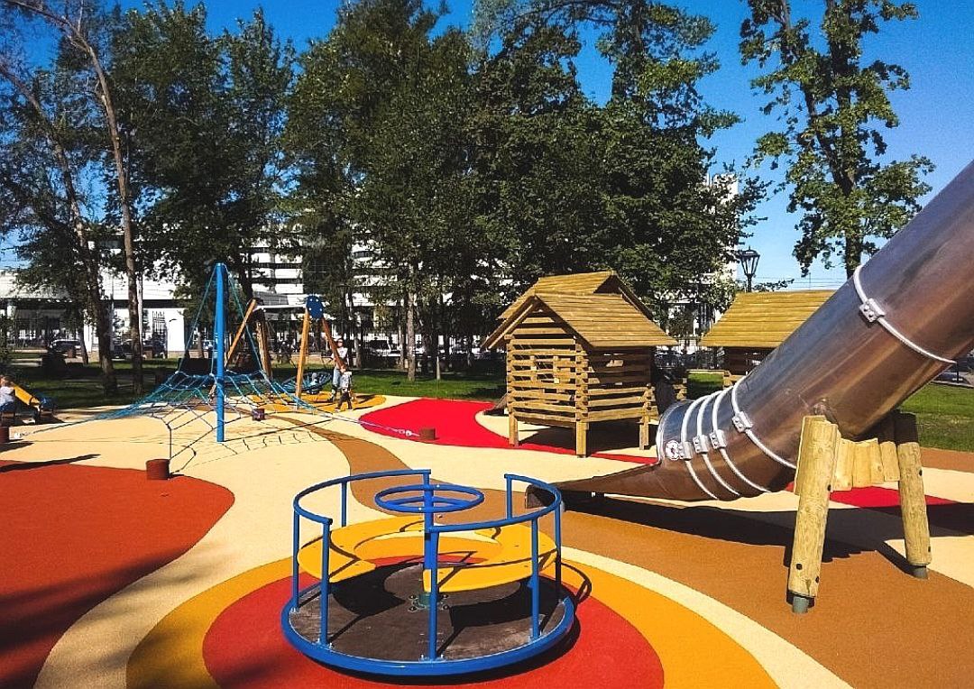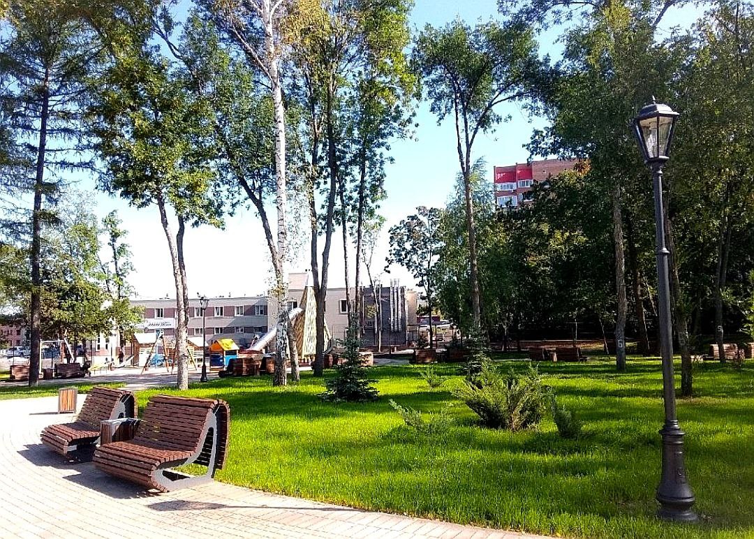 Была уложена плитка, сделаны газоны с авто-поливом и эко-дорожки, где плитка чередуется с травяным покрытием. В сквере установили новое освещение и дизайнерские лавочки для отдыха. Для юных жителей обустроили многофункциональную детскую площадку из экологически чистых материалов с антитравматическим покрытием.
