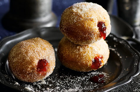 Тем временем разогрейте 1-2 литра подсолнечного масла до 160 °C (проверка: кубик хлеба должен стать золотистым за 30 секунд). Жарьте пончики партиями по 2-3 минуты с каждой стороны до золотистого цвета. Затем выложите на бумажные полотенца. Чтобы наполнить джемом, сделайте отверстие в каждом пончике с помощью шпажки и аккуратно добавьте 340 г клубничного джема из кондитерского мешка. Для красоты обваляйте готовые пончики в сахарной пудре.