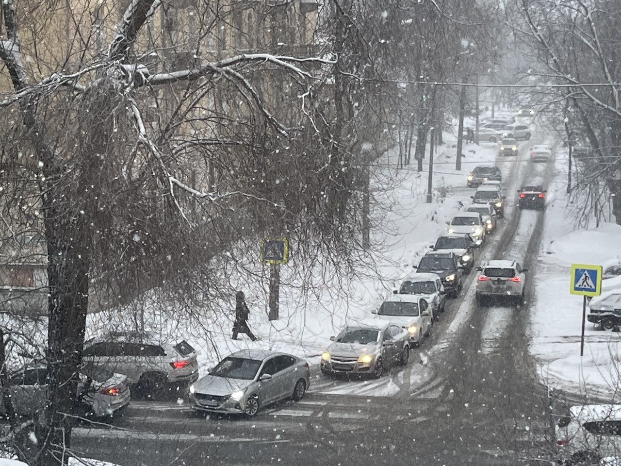 Движение в городе заметно затруднено. Снегопад и час пик привели к заторам на многих улицах. В это время многие жители возвращаются с работы, из-за чего поток машин значительно увеличился.