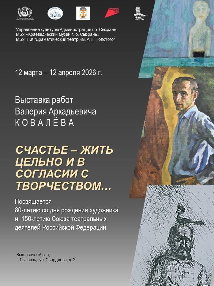 С 13 марта в Выставочном зале (ул. Свердлова, 2) – выставка работ художника Валерия Аркадьевича Ковалёва «Счастье – жить цельно и в согласии с творчеством», посвящённая Международному Дню театра и 80-летию со дня рождения художника.