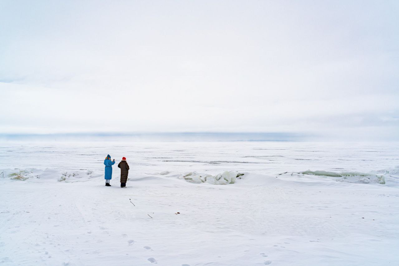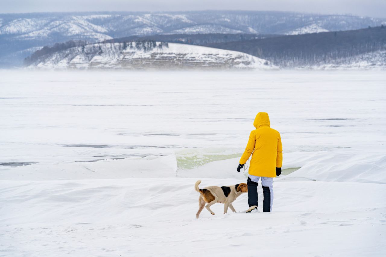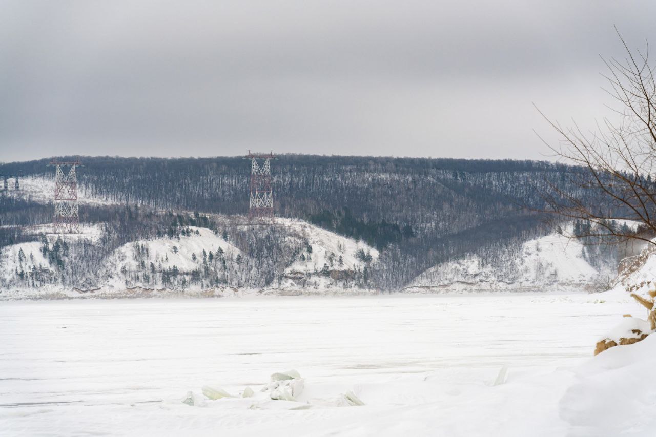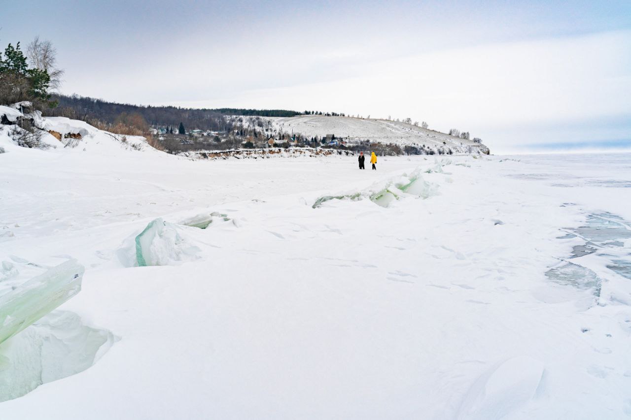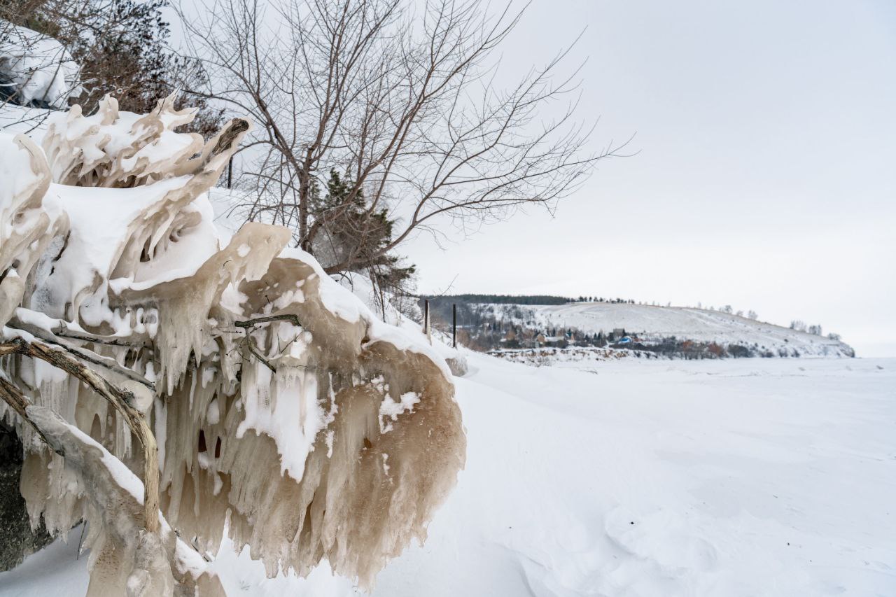 С берега в Берёзовке днём невероятный вид на горы – Лепёшку и Молодецкий курган И если тёплая погода ещё не успеет внести свои коррективы, то можно застать даже местами прозрачный лёд и красиво обледеневший склон.