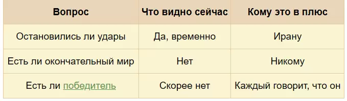 Еще совсем недавно обсуждали возможные сценарии – от полного подавления Ирана до уверенной победы Америки. Но сегодняшний расклад говорит о другом: пауза, перемирие, активные посредники, снижение цен на нефть и даже выдохнувшие рынки. Но кто же все-таки выиграл в этой неочевидной игре?