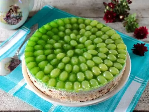 Подготовьте виноград: промойте, высушите и нарежьте пополам. Как только желе застынет, выложите на него виноград и залейте оставшимся желе. Оставьте торт в холодильнике до окончательной консистенции, примерно на 2 часа. После этого аккуратно освободите его от формы, и наслаждайтесь новым шедевром!