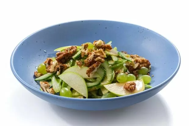 Ищете незабываемый салат, который поможет справиться с холодами и привнесет в ваш рацион нотки свежести? Этот салат с грецкими орехами и сельдереем станет настоящей находкой. Базовые ингредиенты, такие как яблоки, виноград и соленые огурцы, удобно собраны в равных пропорциях, создавая гармоничное сочетание ароматов и текстур.