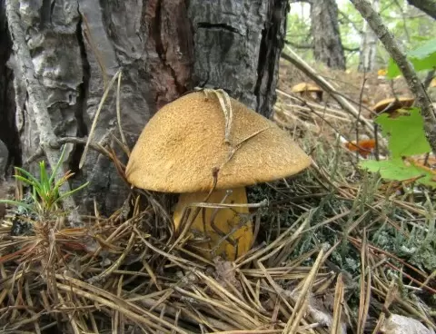 Моховик желто-бурый — гриб среднего размера, который можно легко узнать по следующим характеристикам: