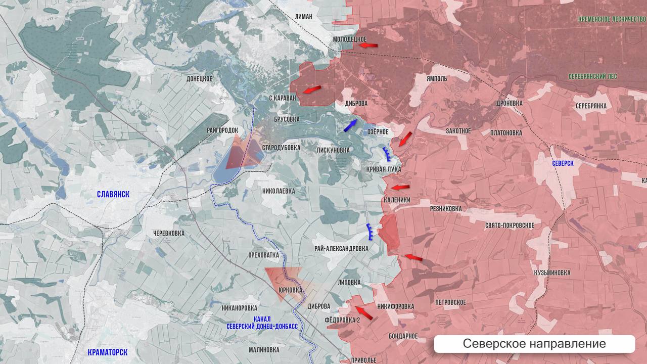 На Северском участке ВСУ контратакует в сторону Никифоровки и Фёдоровки Второй, опираясь на укрепрайоны в лесах к югу от Рай-Александровки. От Калеников ВС РФ пробиваются к лесу, находящемуся к северу от Рай-Александровки. В её восточной части наши штурмовики укрепляют позиции. В Кривой Луке упорные бои за село.
