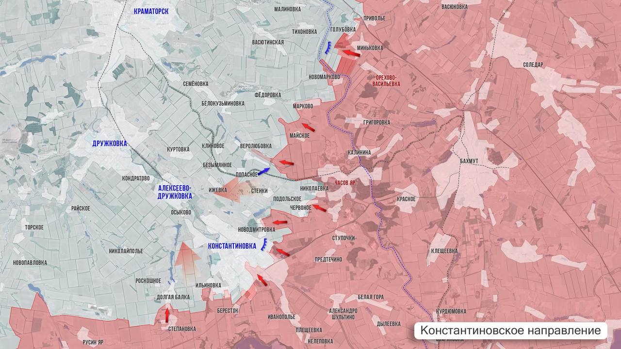 На Константиновском направлении тяжёлая ситуация остаётся в районе Долгой Балки и Ильиновки, где ВСУ упорно держатся за свои позиции. На восточном фланге идут бои в районе Новодмитровки, Червоного и в южной части Часов Яра.