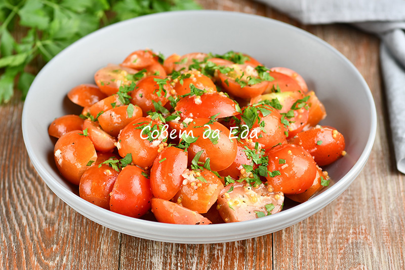 Для начала нужно взять небольшую банку и поместить туда пропущенный через пресс чеснок, соль, сахар (при желании можно использовать мёд) и зернистую горчицу. Если горчица обычная, можно добавить одну чайную ложку.Затем следует влить лимонный сок и растительное масло (подойдёт подсолнечное рафинированное). Добавьте сушёный базилик, который можно заменить любыми предпочтительными травами.Закройте банку крышкой и хорошенько встряхните до полного растворения соли и сахара. Результатом станет густая, ароматная заправка, которую можно использовать не только для помидоров, но и для различных овощных салатов.Помидоры разрезаются пополам (если это маленькие плоды); если крупные – нарезаются дольками. Заправку добавляют к подготовленным овощам.После того как все ингредиенты хорошенько перемешаны, закусочные помидоры будут готовы к подаче. Они не только популярны, но и могут храниться в холодильнике до трёх дней. Вкус при этом лишь становится насыщеннее.Кулинарный креатив и разнообразие вкусов – вот, что обязательно сделает ваши будни и праздники ярче. Насыщенные томаты с кислой заправкой, чесноком и базиликом приятно порадуют как вас, так и ваших близких!