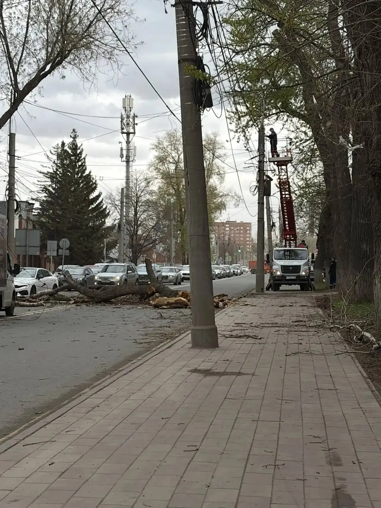 Поваленное ветром дерево на улице Мичурина оборвало троллейбусные провода