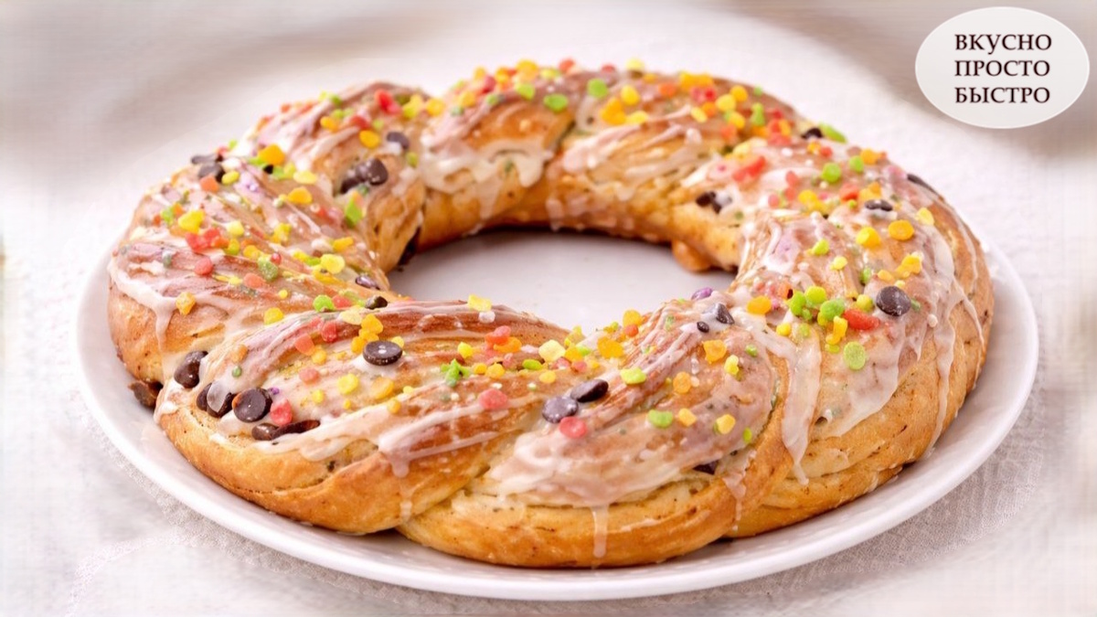 Для глазури взбейте 60 г маскарпоне с 25 г сахарной пудры. Обильно смажьте глазурью остывший венок и украсьте разноцветными цукатами. Такой венок станет изюминкой любого стола на Пасху, собрав вокруг себя радость и теплоту семьи.