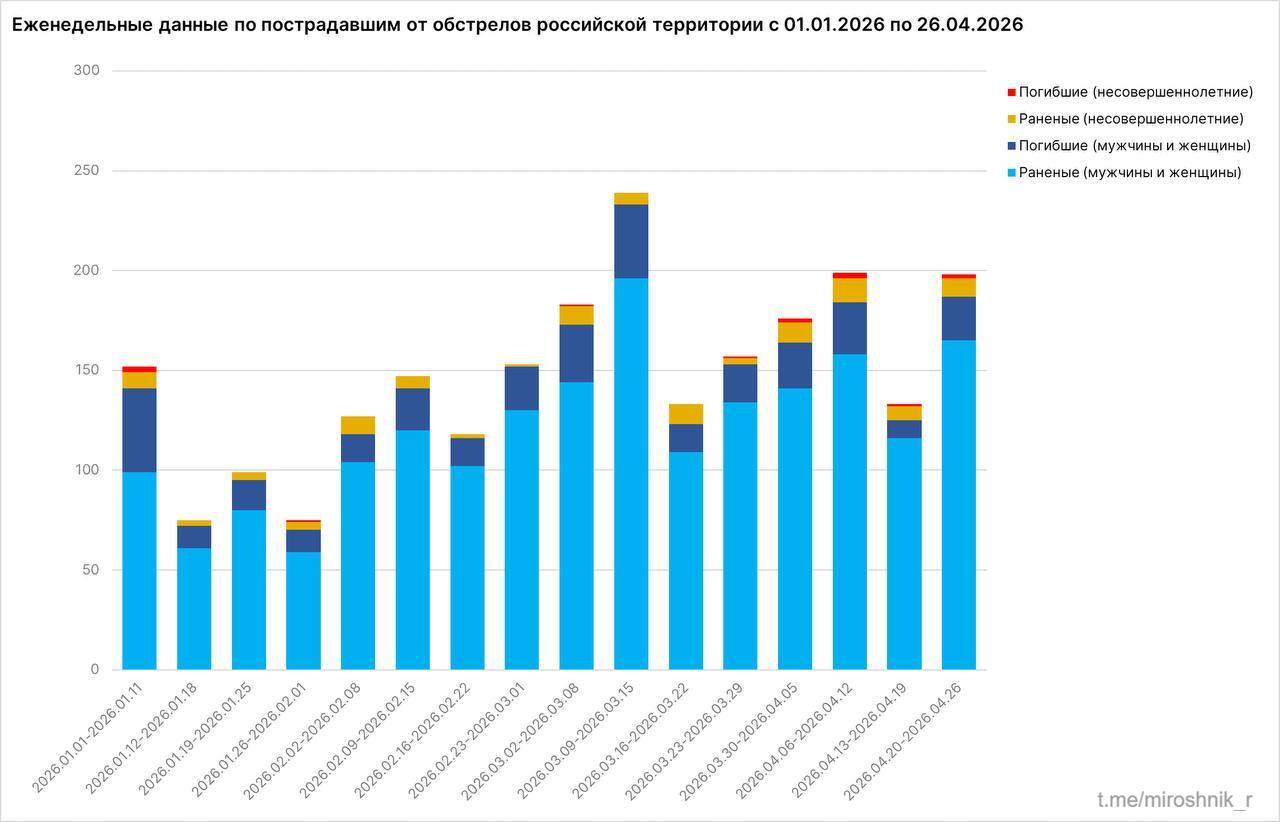 24 человека, в том числе двое детей, погибли за минувшую неделю от атак ВСУ на российские регионы. Еще 174 человека получили ранения, сообщил посол по особым поручениям МИД РФ Родион Мирошник.